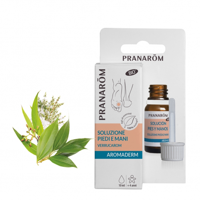 AROMADERM Verrucarom soluzione Piedi e mani BIO* permette di trattare con precisione la zona cutanea colpita; grazie agli oli essenziali di Cannella della Cina, Litsea citrata, Albero del tè, Niaouli, Eucalipto mentolato e di olio vegetale di Ricino, la pelle viene purificata: si rigenera in modo naturale e ritrova un aspetto sano.