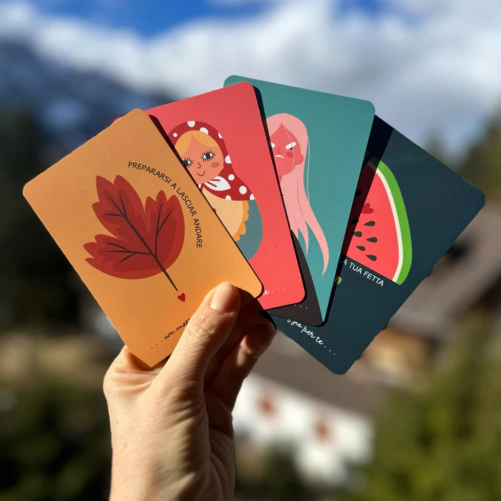 Ogni carta custodisce un’illustrazione e due messaggi – uno sul fronte (spesso una domanda che apre la riflessione) e uno sul retro (un pensiero che offre risposta e guida).