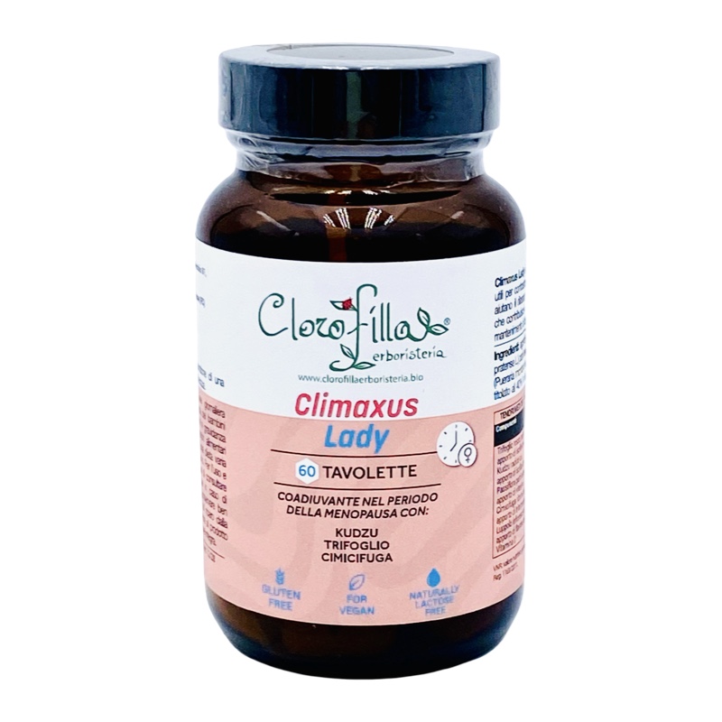 Climaxus Lady è un integratore alimentare a base di: Kudzu (Pueraria lobata), una pianta selvatica originaria del Giappone, contenente ben 6 tipi diversi di fito-estrogeni benefici nel contrastare molti sintomi della menopausa, ed in particolare dell’isoflavone puerarina, facilmente assimilabile e altamente biodisponibile; contiene inoltre sali minerali come Calcio, Fosforo e Ferro ed è un prezioso alleato in casi di ansia e fame nervosa. Abbiamo associato anche: il Trifoglio Rosso, contenente isoflavoni ben noti in letteratura per la loro efficacia, con un interessante potere antiossidante, potenziando così l’azione del Kudzu; La cimicifuga, rimedio per i disturbi tipici della menopausa, non solo vampate di calore e sudorazioni notturne ma anche disturbi del sonno e irritabilità; La Passiflora grazie al suo effetto calmante e sedativo, è stata associata al Luppolo ottimo sedativo ed equilibratore nervoso, che migliorano i disturbi del sonno e attenuano l’intensità delle caldane, migliorano di molto gli stati nervosi e ansiosi, stabilizzando l’umore e dando benessere e tranquillità. Infine la vitamina D che aiuta a fissare maggiori quantità di calcio, a rinforzare le ossa e a prevenire fratture e i problemi articolari tipici disturbi dell’osteoporosi.