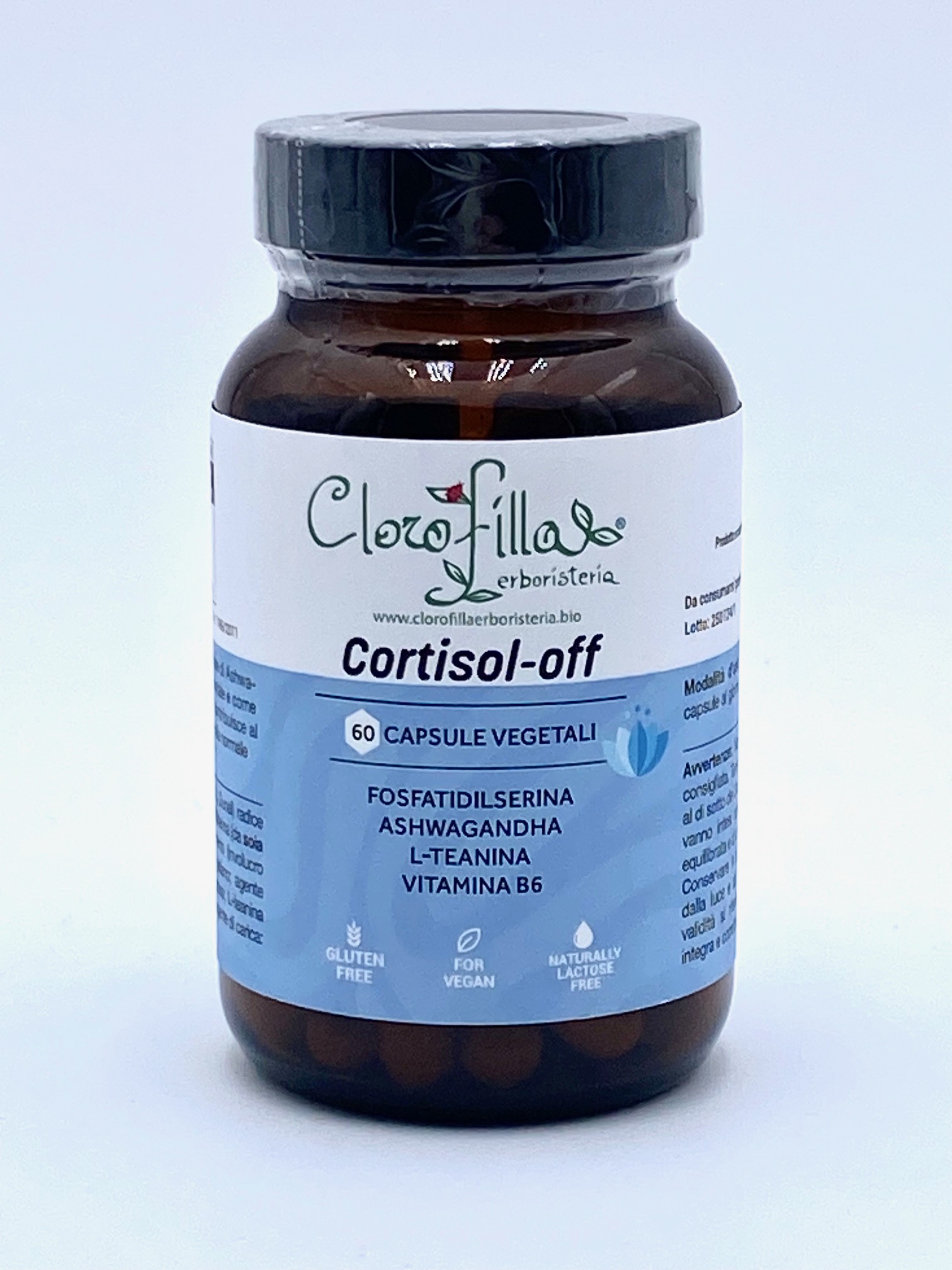 Ingredienti: Withania somnifera L. Dunal radice estratto secco titolato al 5% in withanolidi, fosfatidilserina da Glycine max L. Merr. semi, agenti di rivestimento (involucro capsula): idrossipropilmetilcellulosa, gomma di gellano, agente antiagglomerante: sali di magnesio degli acidi grassi, L-teanina da Camellia sinensis L. Kuntze foglie, agente di carica: cellulosa, vitamina B6 (piridossale-5-fosfato).