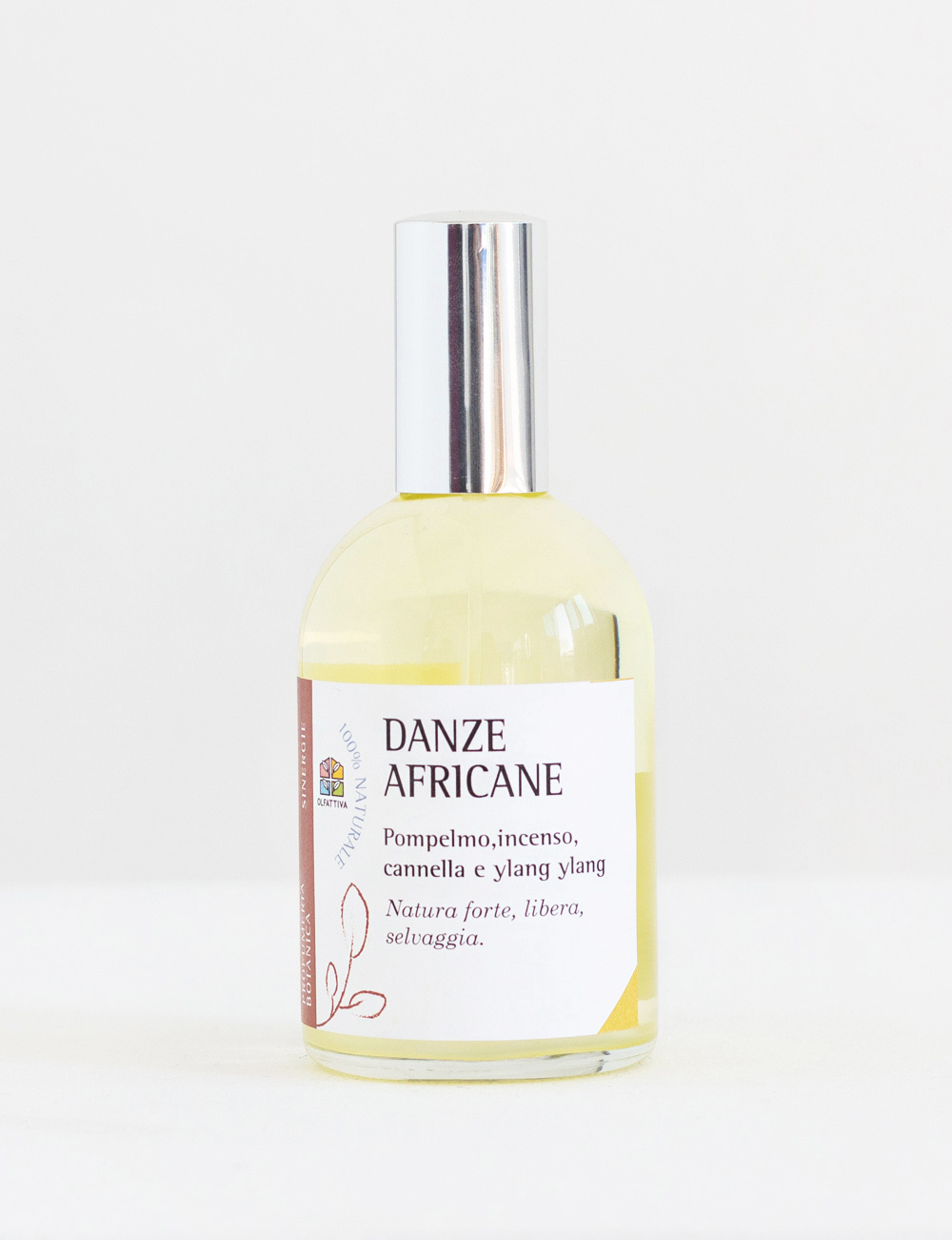 Profumo per ambienti in spray costituito da olii essenziali puri al 100%, acqua e alcool biologico.