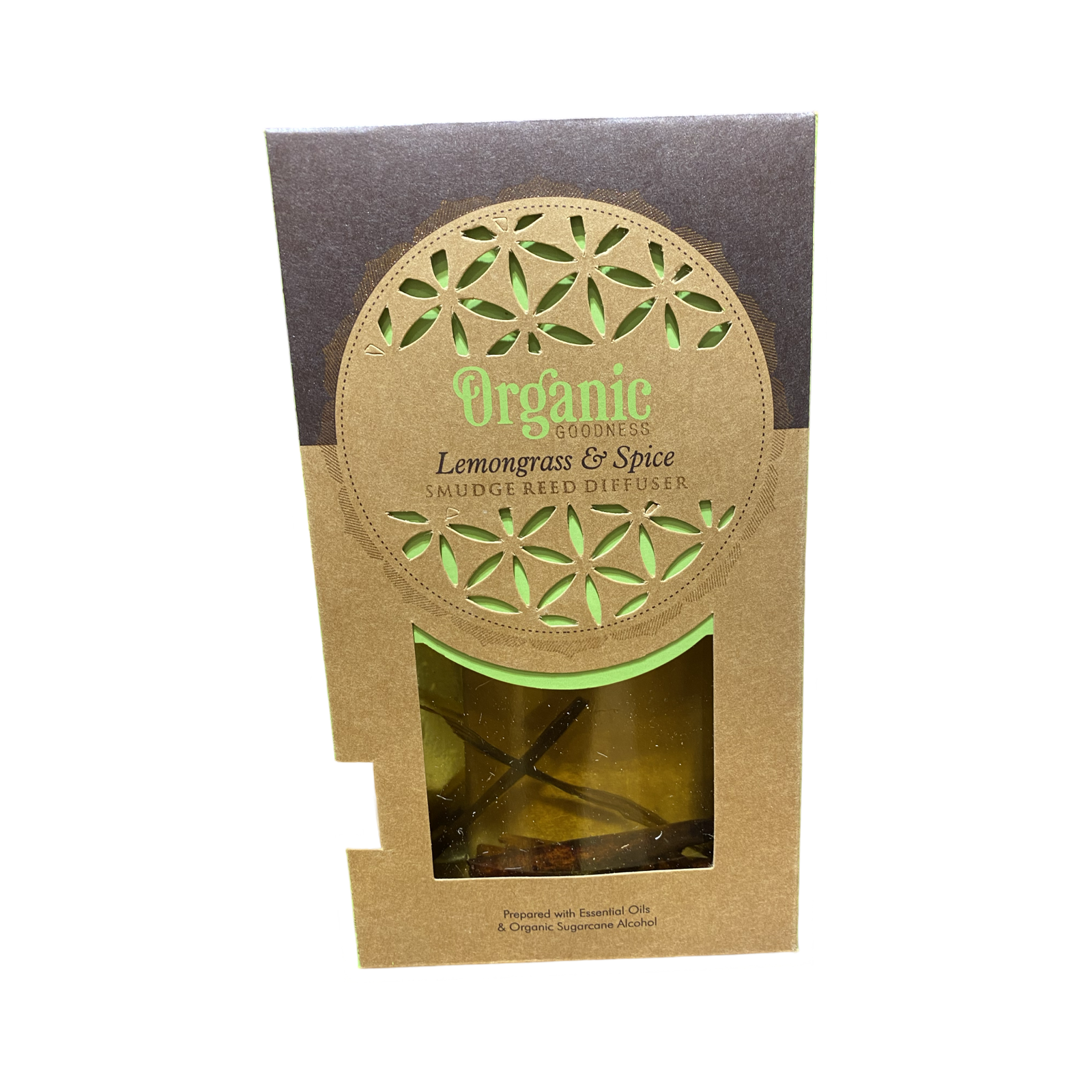 Diffusore con bastoncini al profumo di Lemongrass e Spezie. A base di alcool biologico alimentare e oli essenziali. Il diffusore è reso più bello dalle foglie, i rametti e i fiori inseriti all’interno della bottiglia. Confezione da 150 ml.