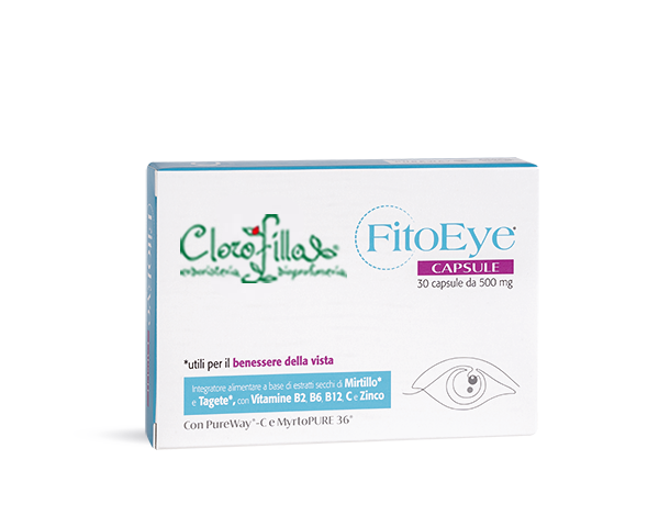 FITOEYE è un integratore alimentare a base di estratti secchi di Mirtillo e Tagete, con Vitamine B2, B6, B12, C e Zinco. Il Mirtillo ed il Tagete sono utili per il benessere della vista, mentre la Vitamina B2 e lo Zinco contribuiscono al mantenimento della capacità visiva normale.