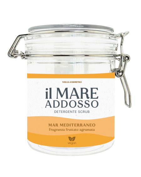 DETERGENTE E SCRUB – ll Mare addosso è un prodotto naturale per la detersione quotidiana, un concentrato di mare a base di sale marino ed oli vegetali ad alta tollerabilità cutanea. Mentre deterge, rinnova le cellule, regola la sudorazione, ripristina il PH, deodora a lungo, arricchisce con le proprietà intrinseche dell’acqua marina e degli oli contenuti che svolgono anche un’azione emolliente, idratante, riequilibrante ed addolcente. Può considerarsi un trattamento di talassoterapia o terapia del mare che sfrutta le tante proprietà benefiche dell’acqua marina.