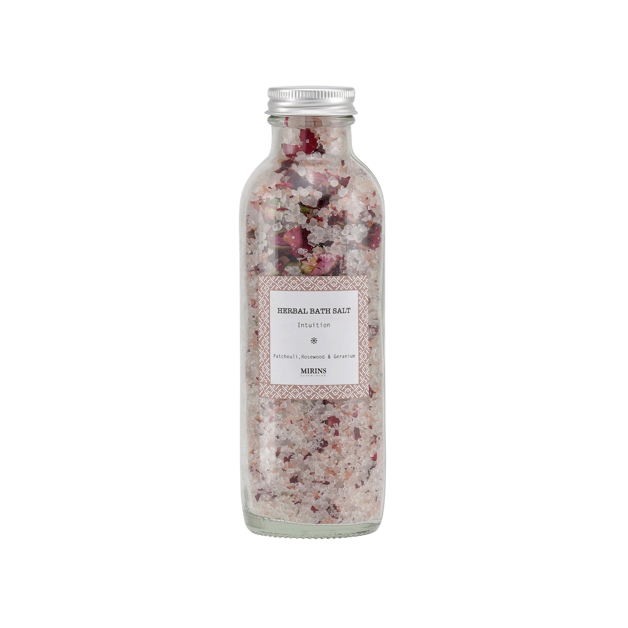 Ingredienti: sale Epsom, sale del Mar Morto, sale rosa dell’Himalaya, boccioli di Rosa, petali di Rosa, Oli essenziali: Patchouli (Pogostemon cablin), Legno di rosa (Aniba rosaedora), Geranio rosa (Pelargonium graveolens), Arancio dolce (Citrus aurantium).