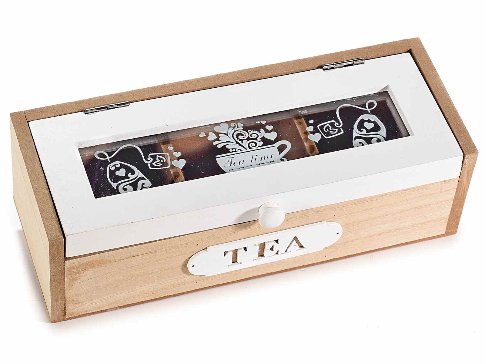 Scatola del té in legno a 3 scomparti con vetro decorato.