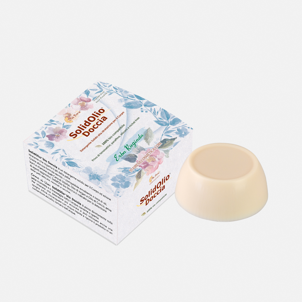 SolidOlio bio DOCCIA è un detergente solido per il corpo, privo di sapone e tensioattivi aggressivi e ideale per: